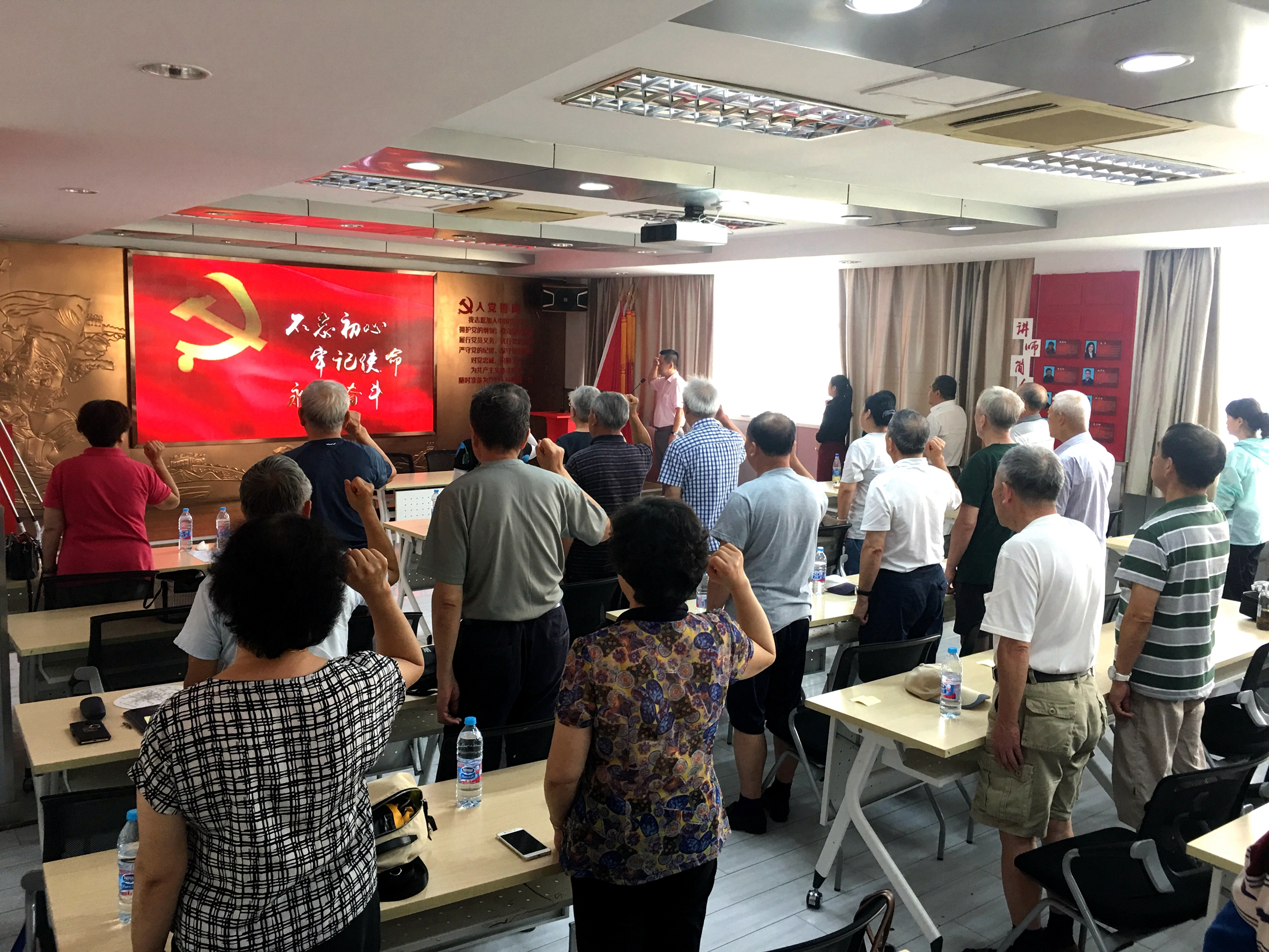 情景党课分为互动交流、重温誓词和践行初心三个环节。在“互动交流”环节,主持人以“爱之助”暖心工作坊的党员志愿者为引子,结合短视频、照片等素材简要介绍了友谊辖区内居民区、社区单位、“两新”组织中那些默默无闻、乐于奉献、勇当先锋、为党旗增辉的党员们的优秀事迹。现场还邀请到了宝林四村党员志愿者陈宝兰医生交流心得,当陈医生介绍到持续四个月照顾邻居吉师傅时,一句朴素的“别人需要帮忙,我就关心关心他、帮帮他” 赢得现场党员持续不断的掌声,也让普通党员的党性在党旗下熠熠生辉。在“重温誓词”环节,友谊路街道领誓人、宝钢六村党总支书记高璐同志,带领大家面向党旗,庄严宣誓,重温入党时刻,坚定理想信念。在“践行初心”环节,社区党员们纷纷写下了对党的寄语,并表示这样的情景党课形式新颖,讲身边人、身边事,更令人感觉亲切与感动。